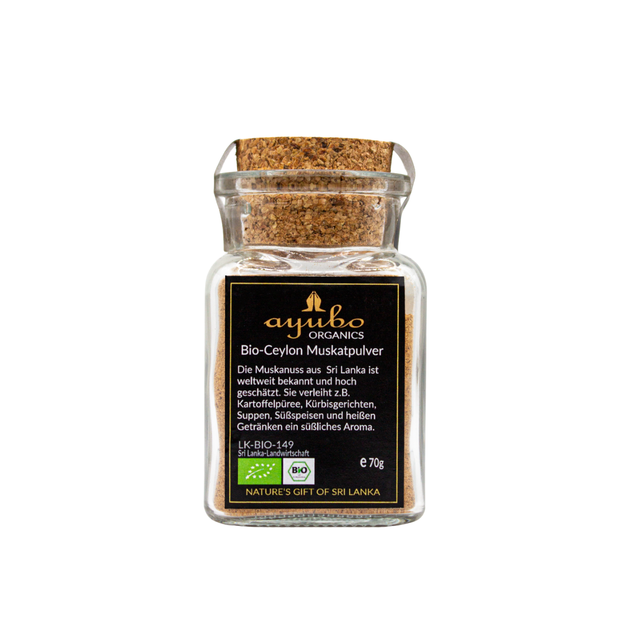 Unser Muskatpulver stammt aus kontrolliert biologischem Anbau in Sri Lanka. Die Muskatnüsse werden von Hand geerntet und schonend vermahlen